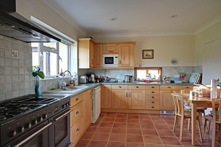 7’10 x 7’4 with a range of matching base and eye level units with rolled edge work surfaces, single bowl single drainer sink unit with mixer tap, half tiled surround, double glazed window and door to rear, freestanding washing machine and dryer, floor mounted oil boiler, storage cupboard, low voltage spotlighting to ceiling, tiled flooring
