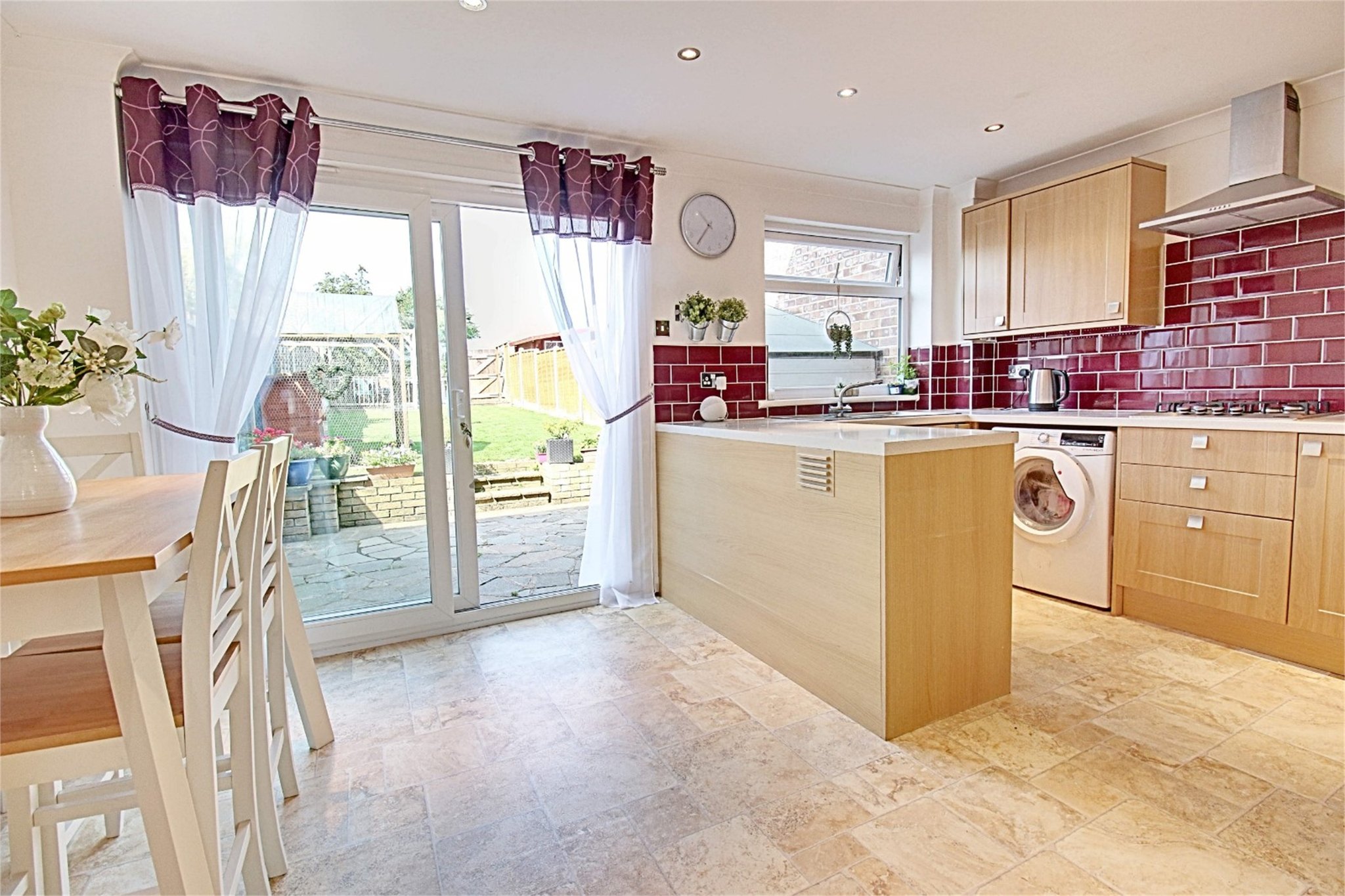 15' 4" x 10' 6" (4.67m x 3.20m)modern kitchen comprising matching base and eye level units with rolled edge work surfaces over incorporating a single bowl single drainer sink with hot and cold taps, 4 ring gas hob with extractor hood and light above and double oven and grill to side. Recess and plumbing for washer and dryer, integrated slim line dishwasher, built in fridge and freezer, spotlighting to ceiling, tile effect vinyl flooring, radiator to wall, double glazed window to rear also with double glazed sliding patio doors onto garden.