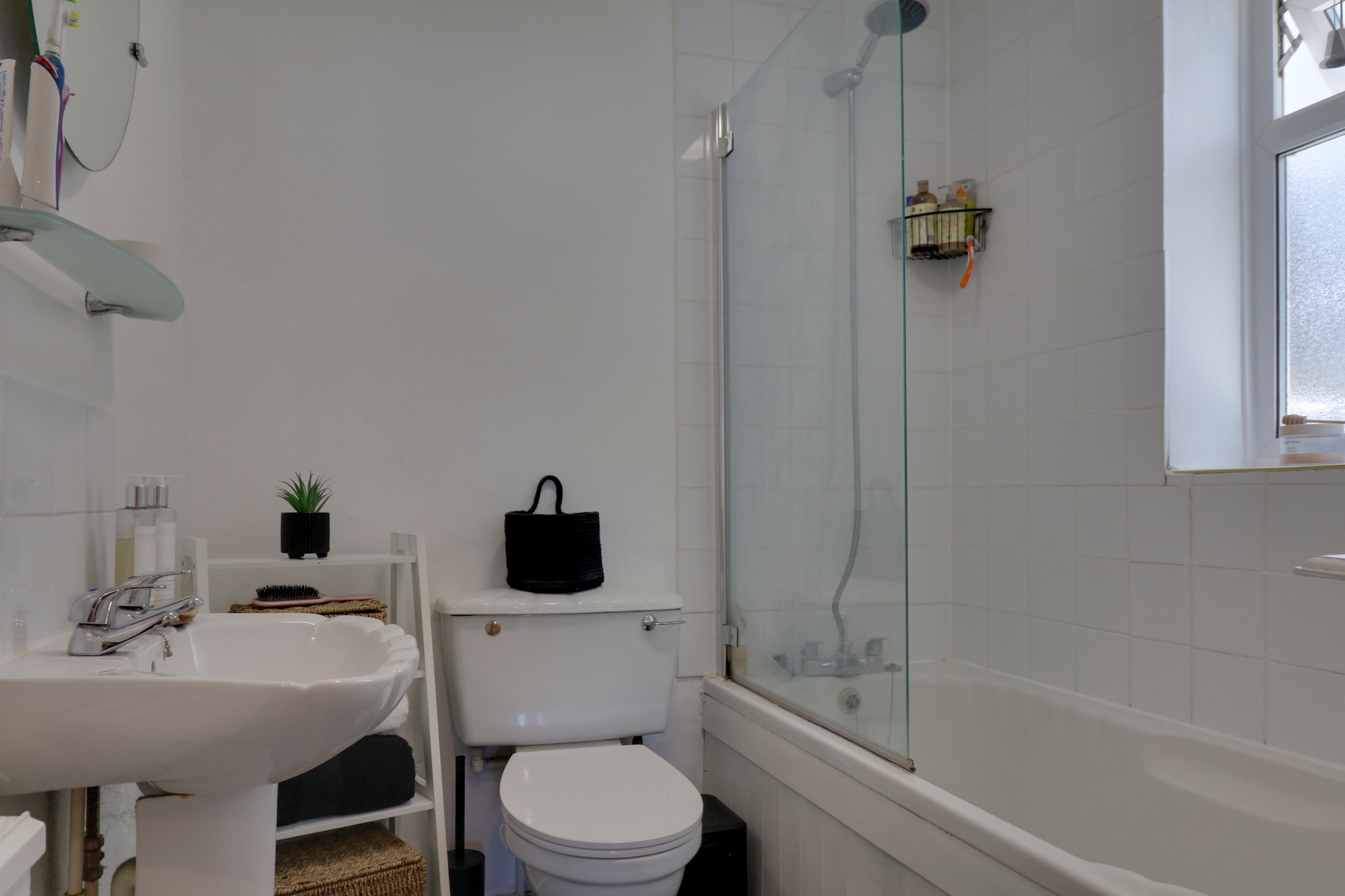 With tiled flooring, tiled surrounds, white suite comprising low level flush wc, pedestal wash hand basin with chrome taps, panel enclosed bath with chrome shower fittings and fitted glass shower screen, double glazed window, double panelled radiator.