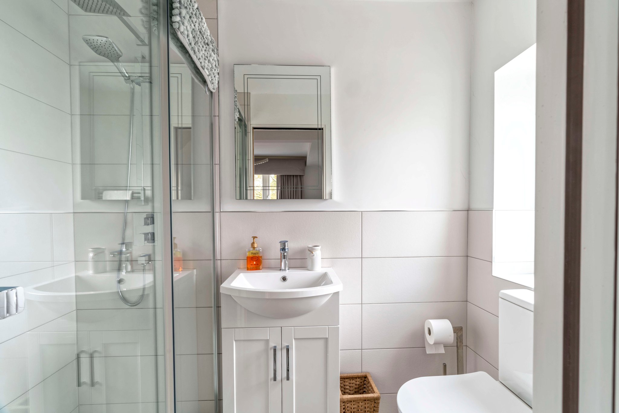 Comprising a large tray shower with a fixed head and removable spring, pedestal wash hand basin insert to a cupboard unit with a monobloc tap, button flush WC, quality tiling to walls and floor, chrome heated towel rail.