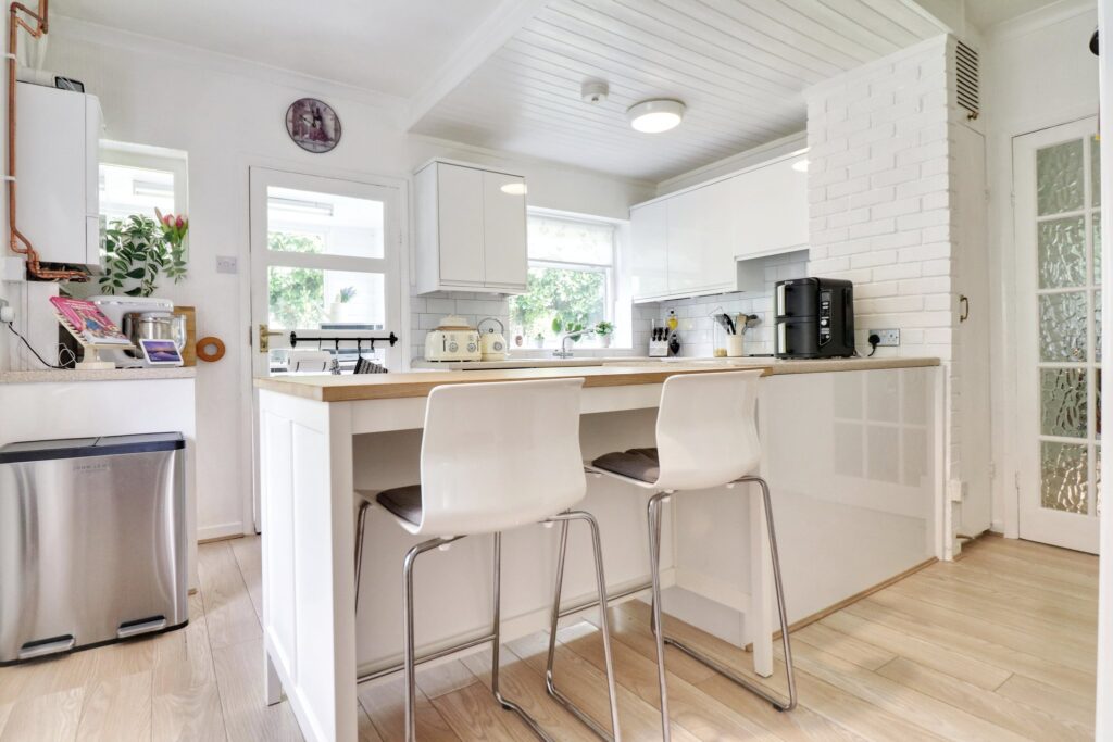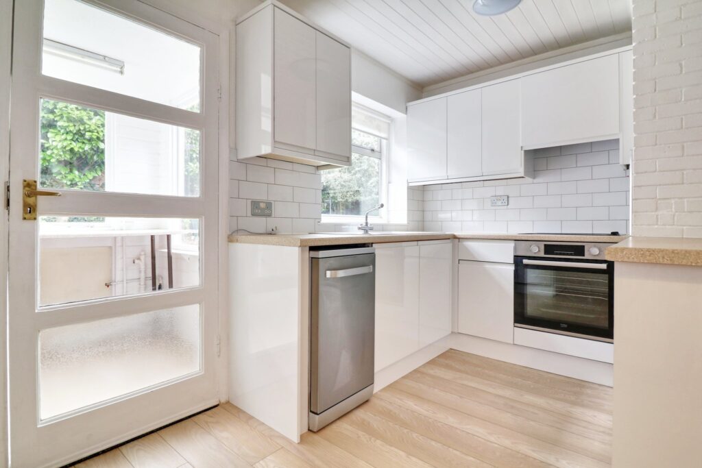 16ft0 x 13ft0 (max) with a range of matching base and eye level units with rolled edge work surfaces, 1 & ¼ bowl sink unit with drainer and mixer tap, double glazed windows on two aspects, wall mounted gas boiler, double panelled radiator, 4-ring electric hob with extractor above and oven beneath, integrated dishwasher, wood laminate flooring, space for table and chairs, second door with access to sitting room, storage cupboard, airing cupboard