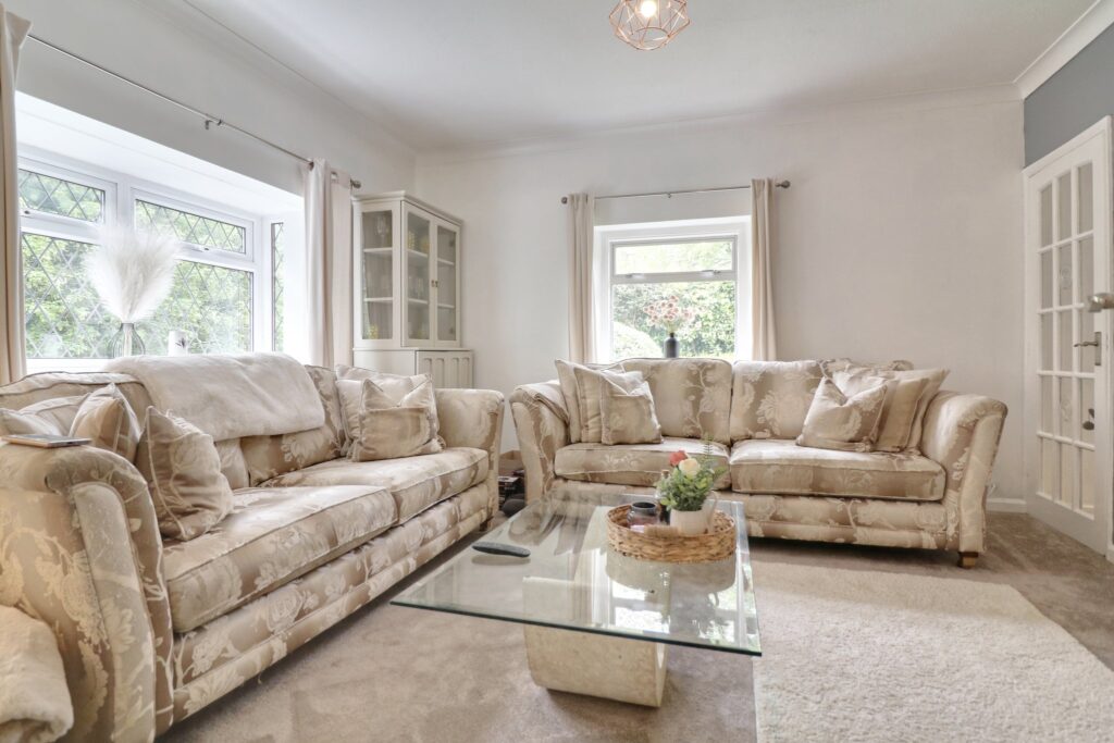 13ft4 x 13ft0 with double glazed windows on two aspects, double panelled radiator, feature electric fireplace, fitted carpet, door to kitchen