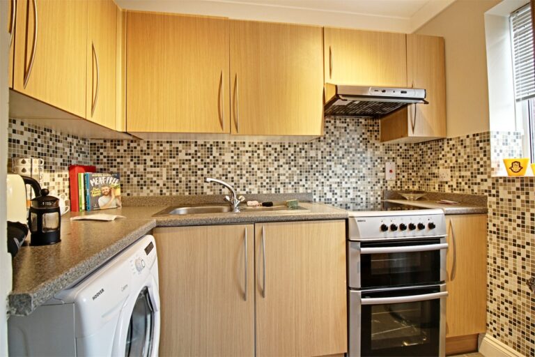 10ft2 x 7ft comprising a stainless steel single bowl, single drainer sink with hot and cold taps and cupboards under, further range of matching base and eye level units with a complementary tiled surrounds, freestanding electric cooker, recess and plumbing for washer/dryer, positioning for fridge/freezer, double glazed window to front, tiled flooring.