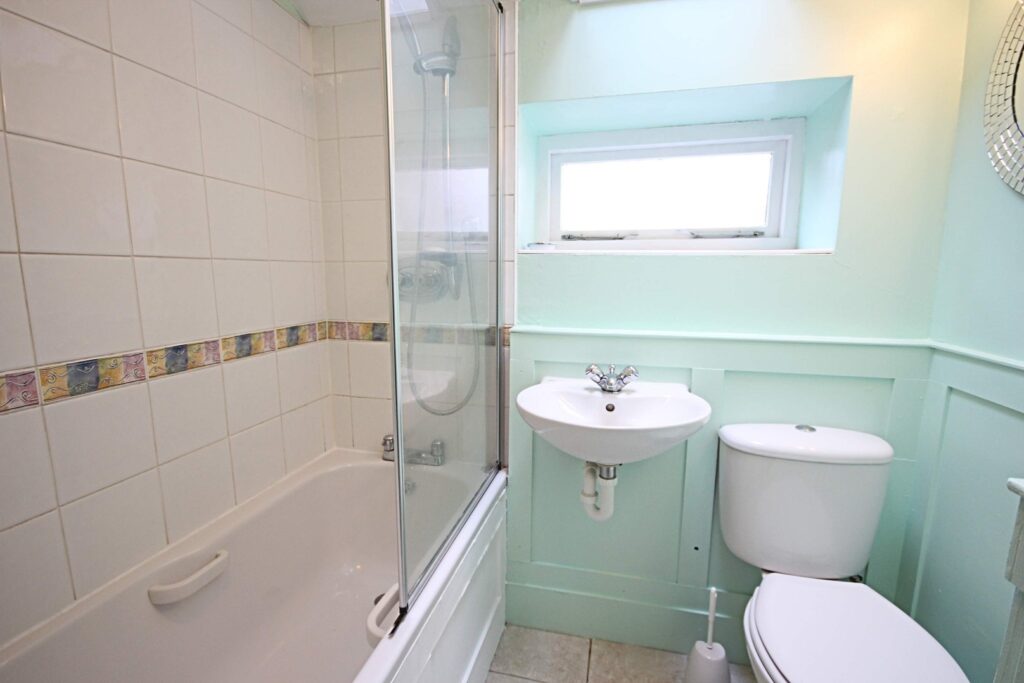 With a white suite comprising panel enclosed bath with mixer tap and power shower above with shower screen, wall mounted wash hand basin, flush wc, obscure glazed window and velux window to ceiling, wall mounted mirror with vanity light above, tiled surround, tiled flooring