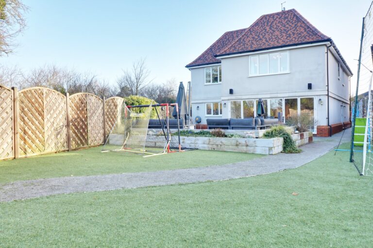 Large rear garden with a mixture of artificial grass and patio area. The garden is enclosed by fencing and provides side access to the front