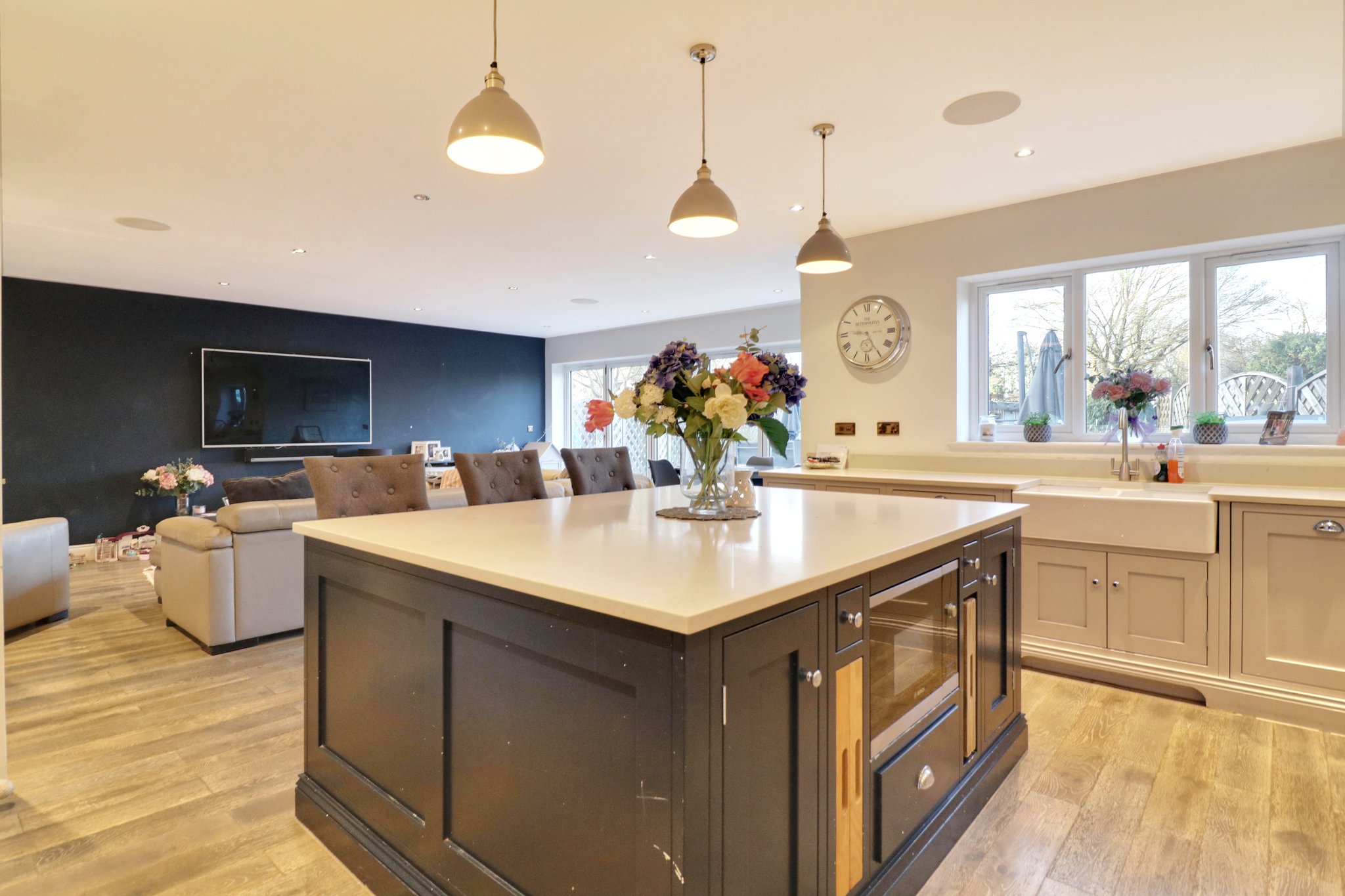 22’8 x 17’8 with large bi-folding doors opening to rear garden, telephone point, TV point, double panelled radiator, spotlighting to ceiling, Sonos speakers, LVT flooring