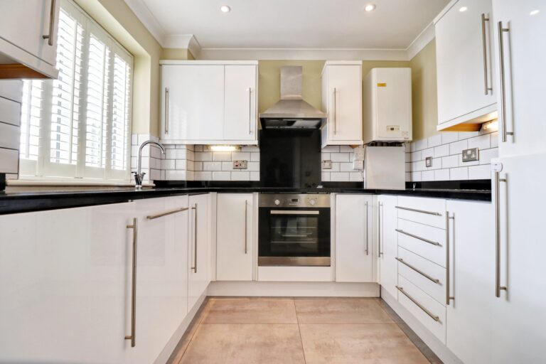 11’5 x 7’2 with a butler sink with mixer tap over and cupboards beneath, fitted in a range of matching base and eye level units with worktop over, 4-ring electric hob with extractor above, built-in oven and grill, integrated fridge freezer, integrated slimline dishwasher, integrated washing machine, double glazed windows to dual aspects, spotlighting to ceiling, partly tiled walls, wooden flooring