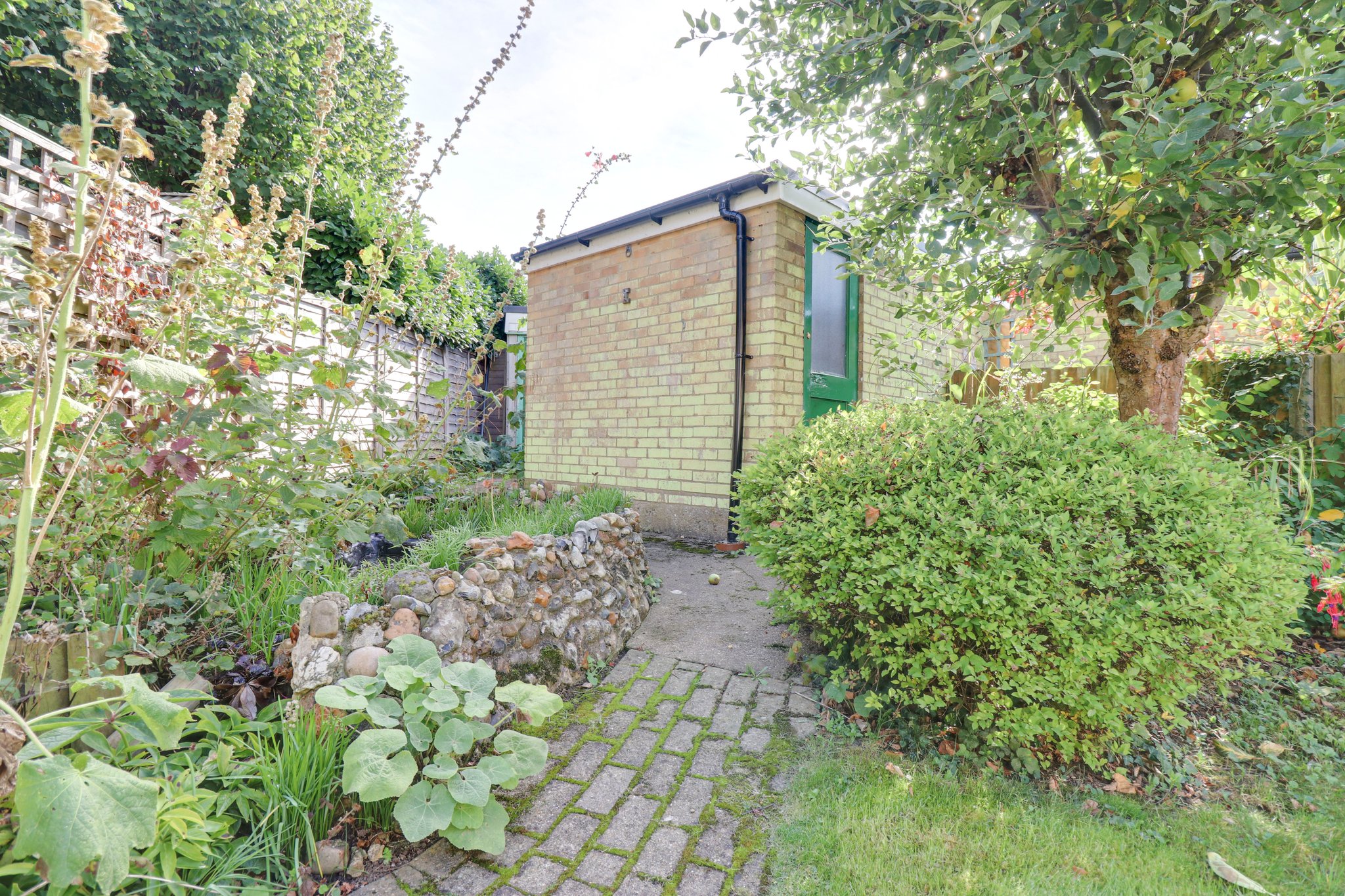 A beautifully landscaped 65ft south facing rear garden which is established and predominantly laid to lawn. Directly to the rear of the property is a small patio area, ideal for a table and chairs. There are stocked flower borders to both sides, an outside tap and a locked gate giving access to the front. To the far end of the garden is access to a single garage, via a side door. Beyond the garage is a timber framed storage shed and also a further outbuilding, suitable for a workshop or further storage.