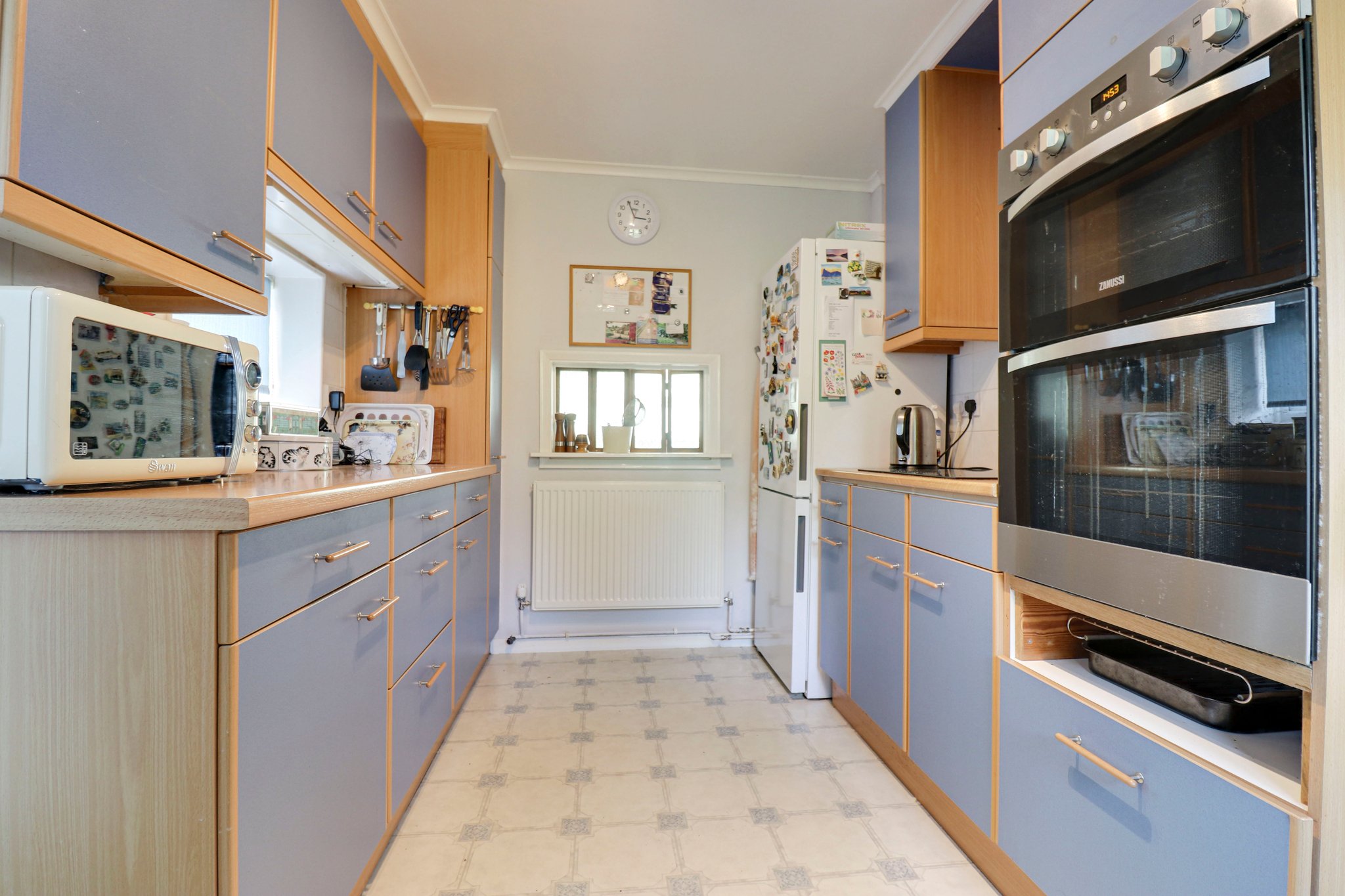 13' 4" x 8' 0" (4.06m x 2.44m) with a double glazed window to front, 1½ bowl single drainer sink with hot and cold taps above and cupboard beneath, further range of matching base and eye level units with a rolled edge worktop over, double oven and grill, four ring ceramic hob, recess and plumbing for washer/dryer, radiator, position for a tall fridge/freezer, double glazed windows to front and side, double glazed door to side, tile effect vinyl flooring.