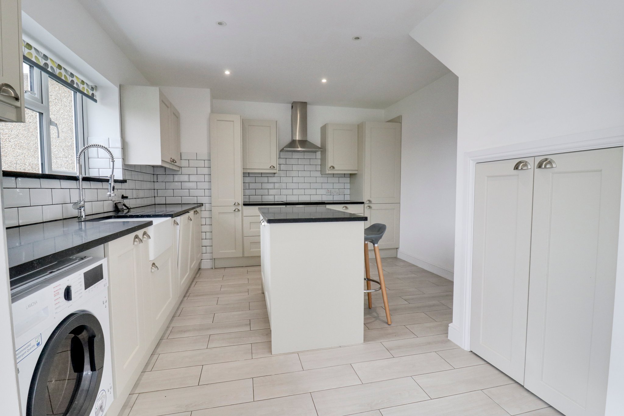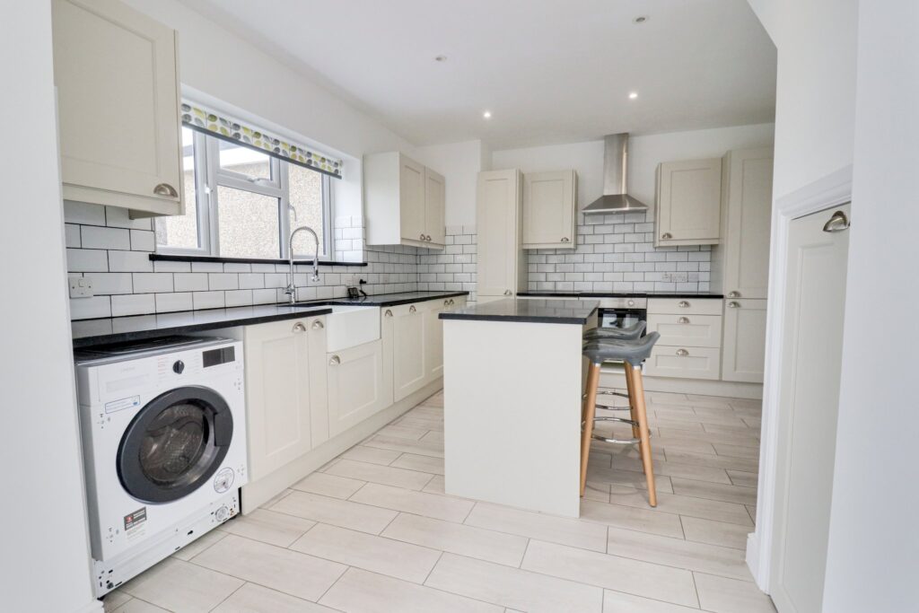 10' 8" x 10' 10" (3.25m x 3.30m) comprising a 1¼ bowl inset stainless steel sink with a stainless steel mixer tap above and cupboard beneath, further range of matching base and eye level units with a quartz worktop over, integrated five ring Neff induction hob with a matching Neff extractor hood above, integrated Bosch oven, integrated dishwasher and washing machine, freestanding Samsung fridge/freezer, larder style cupboard, tiled floor with underfloor heating, low voltage downlighting, double glazed window to front.