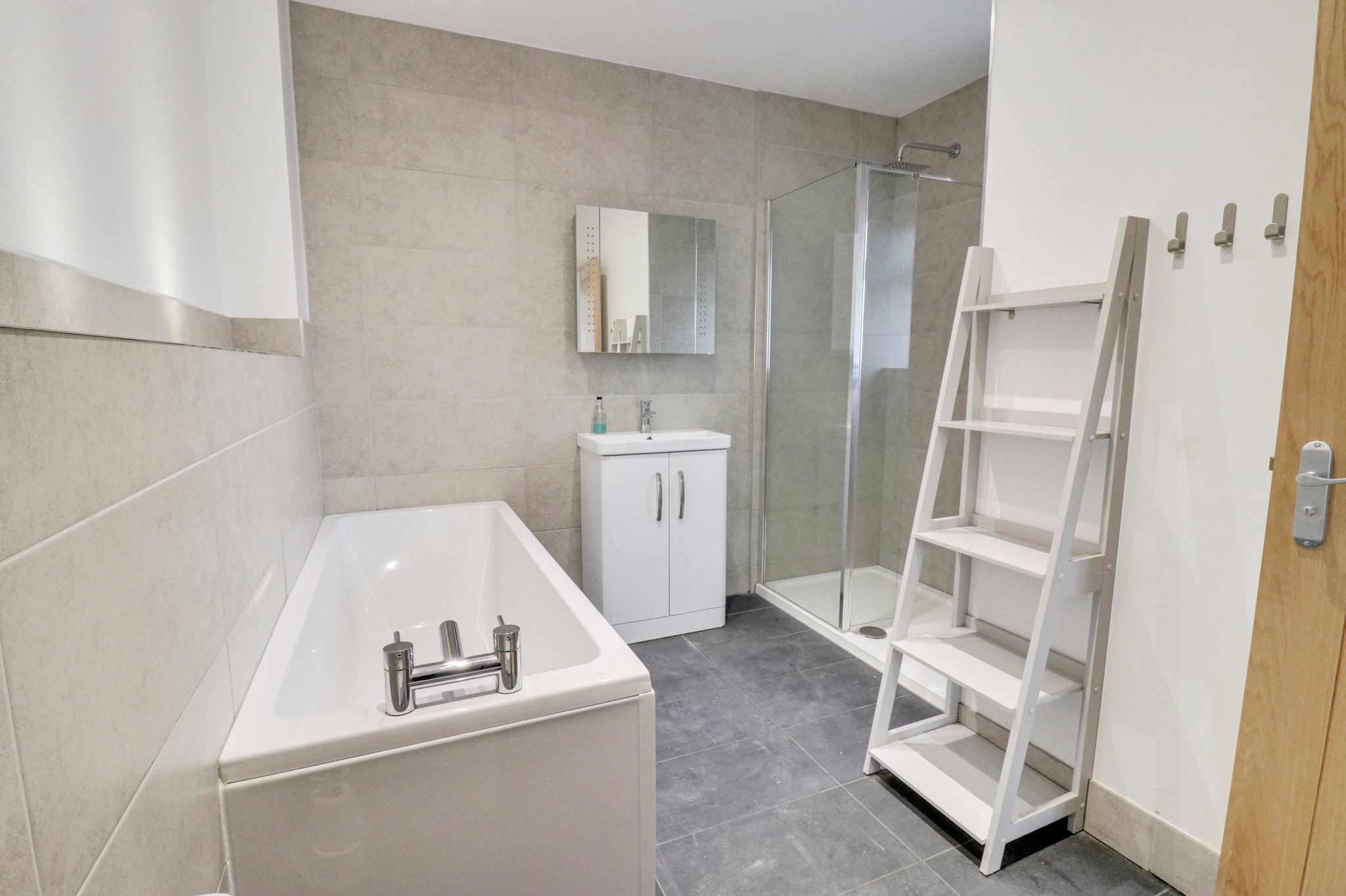 Comprising a panel enclosed bath with a stainless steel mixer tap and a hand held shower attachment, separate walk-in fully tiled shower cubicle with a fixed rain head shower and removable shower head, wash hand basin with a mixer tap and vanity unit beneath, button flush WC, double extractor fan, double glazed window to rear, tiled flooring with underfloor heating.