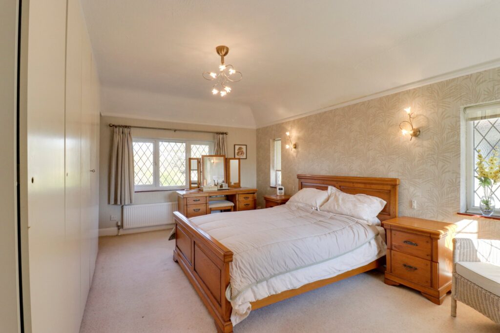 20' 4" (into recess) x 12' 0" (6.20m x 3.66m) a well lit room with leaded light windows to three aspects, the rear one giving fine views over the garden, built-in eaves storage, range of built-in wardrobes.