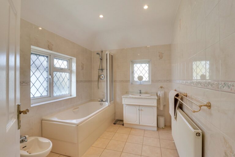 Comprising a flush WC, vanity wash hand basin, radiator, tiled walls, Karndean flooring.