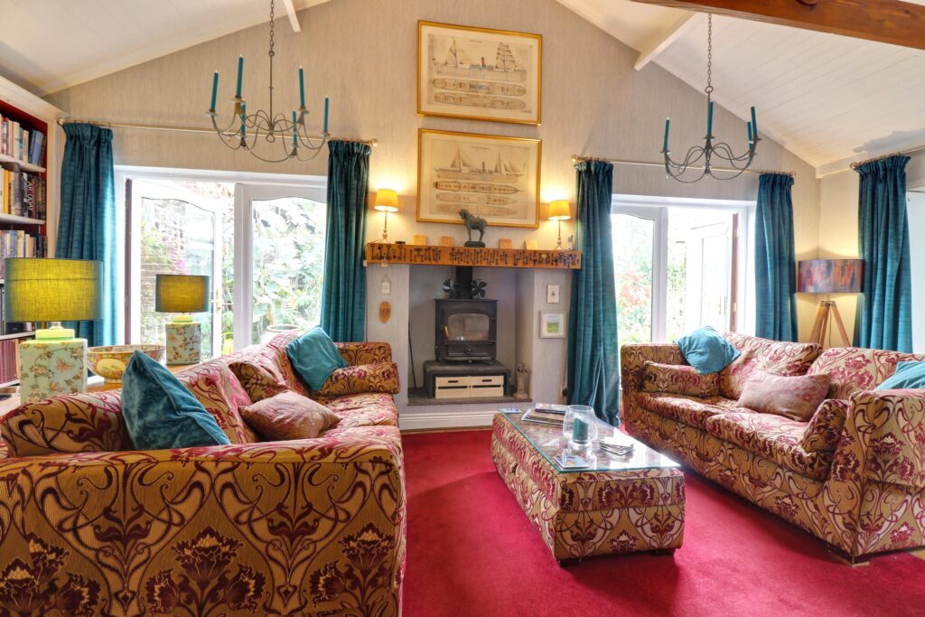 22’2 x 17’8, wonderfully light room lit by large bay window with fine country views, 2 telephone points, turned, hand carved wooden staircase to first floor, York stone flooring, exposed timbers to walls and ceiling, wall mounted air conditioning unit, large stable door for access purely for removals to the rear, integrated music system, picture lights.