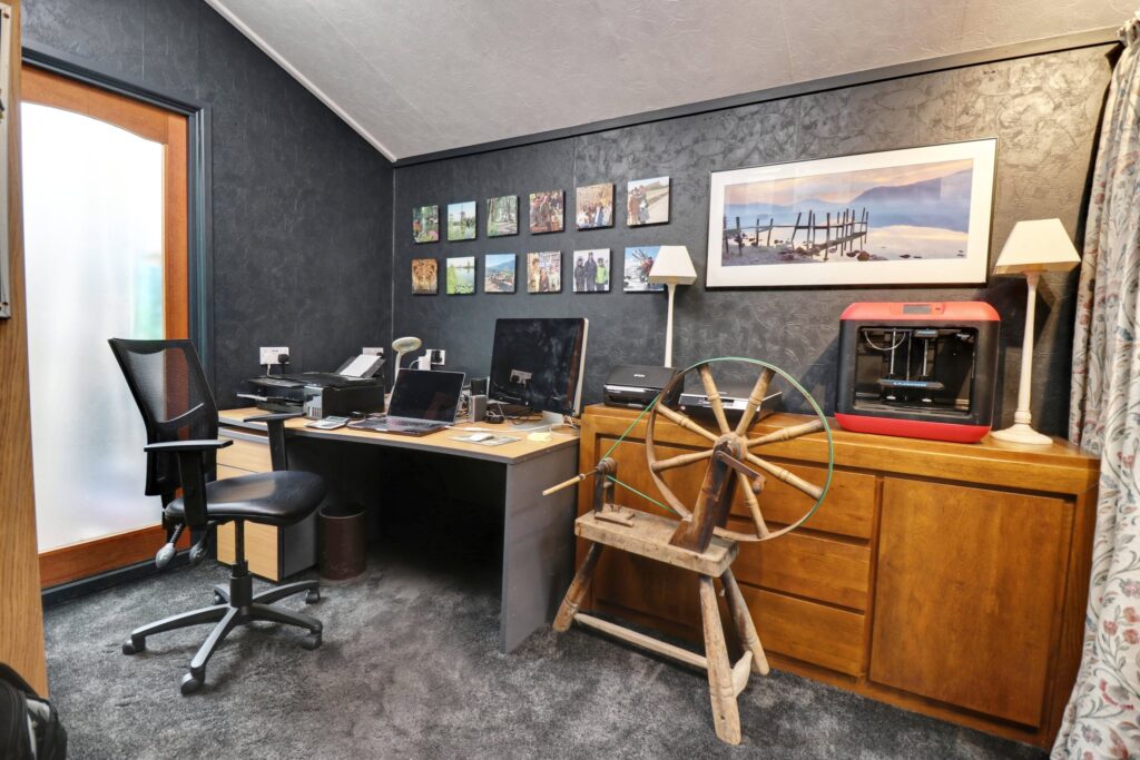 18’6 x 15 pitched roof with exposed timbers to walls and ceiling, piped music from downstairs via speakers in ceiling plus control panel, wall mounted air conditioning unit, low voltage spotlighting, large window to front with wonderful farmland views, integrated vanity area with dressing table, built in cupboards and shelves, tv aerial point.