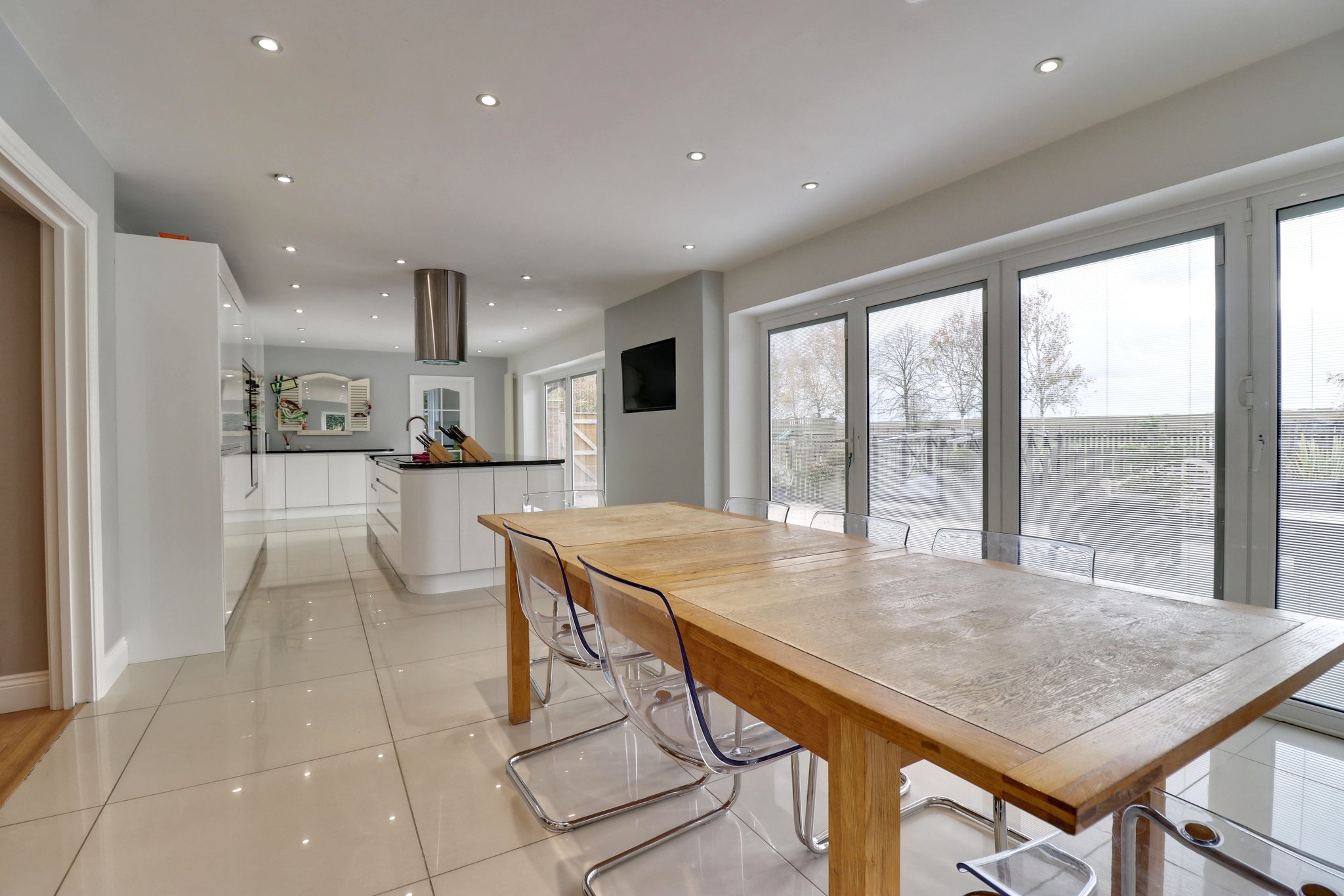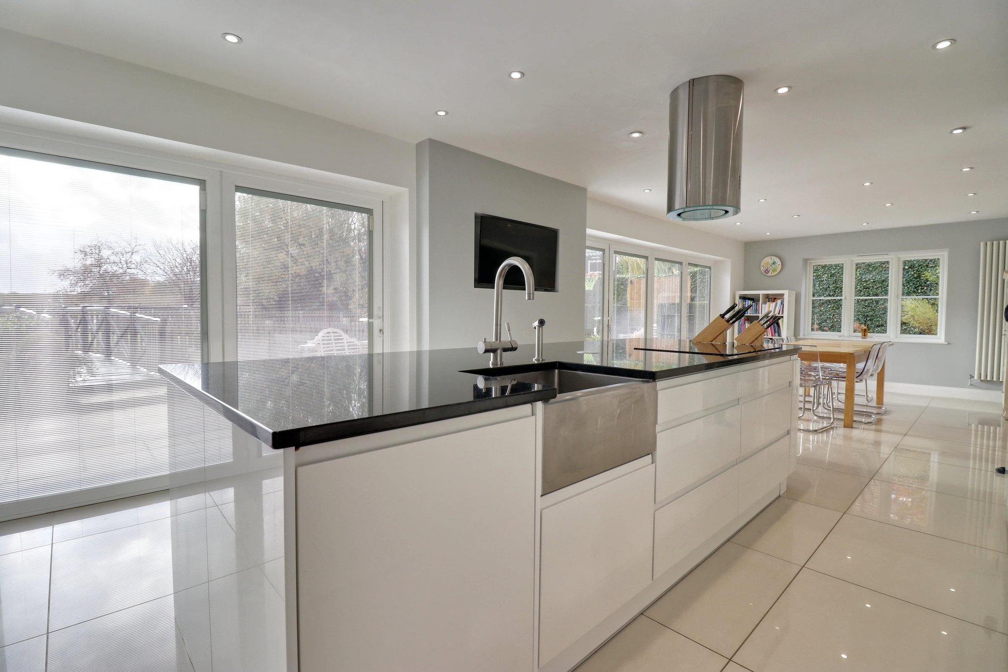 17' 6" x 12' 10" (5.33m x 3.91m) this attractive high gloss contemporary kitchen comprises an inset butler style stainless steel sink unit with a mixer tap with adjacent pull-out hose above and cupboard beneath, further range of matching base and eye level units, integrated dishwasher, six ring Neff induction hob, all fitted into a large island unit with a