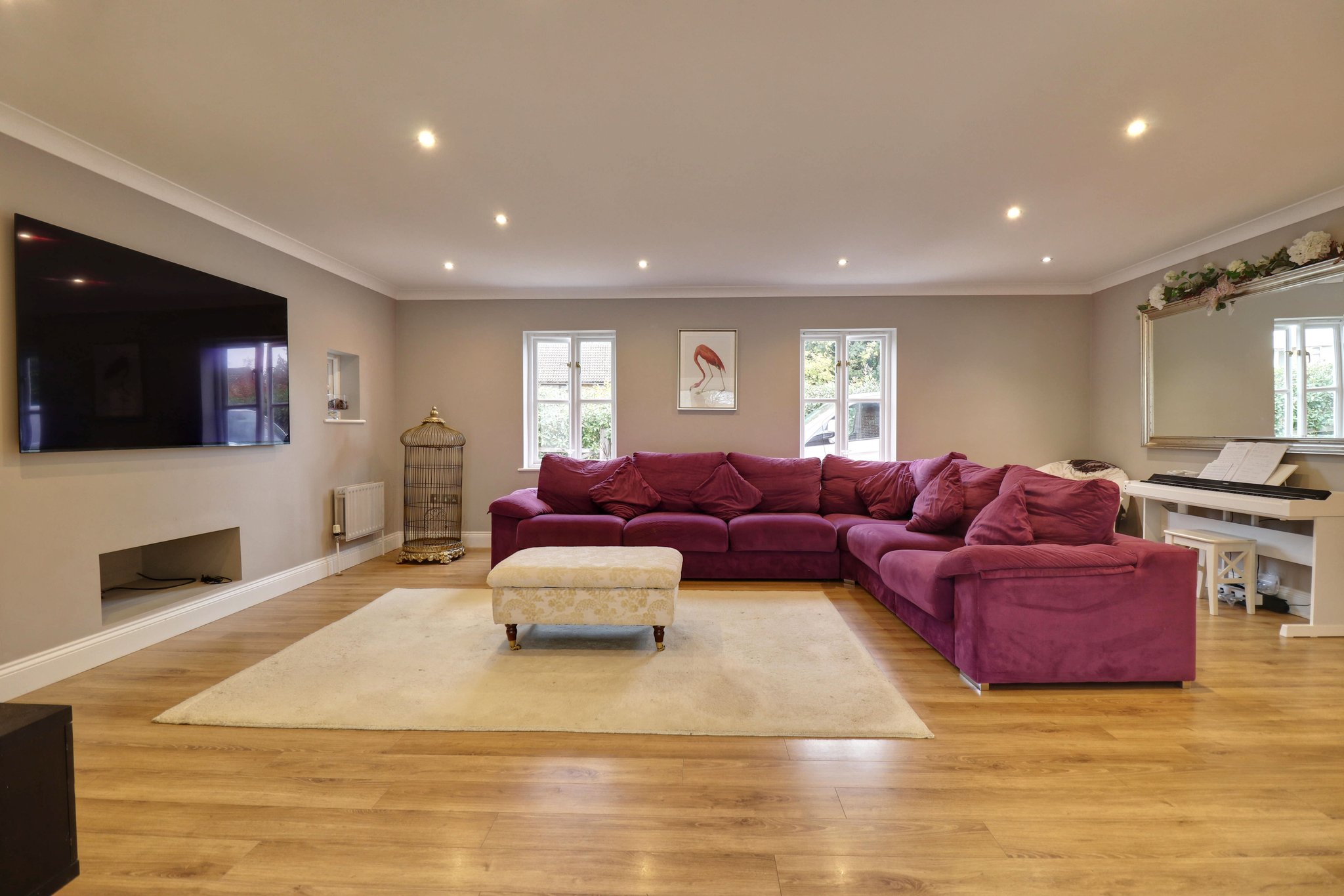 21' 4" x 16' 4" (6.50m x 4.98m) with two windows to front, open through to kitchen/dining room, three double panelled radiators, two further windows to side, wood effect flooring.