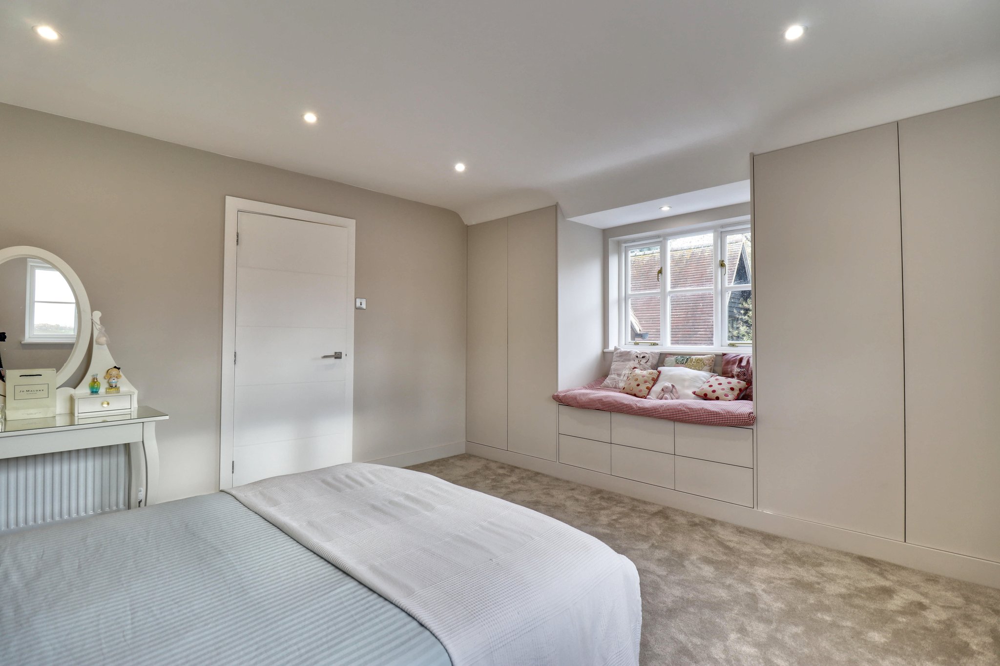 13' 0" x 9' 2" (3.96m x 2.79m) with windows on two aspects providing fantastic views, fitted wardrobe cupboards with a central window seat incorporating drawers, fitted carpet.