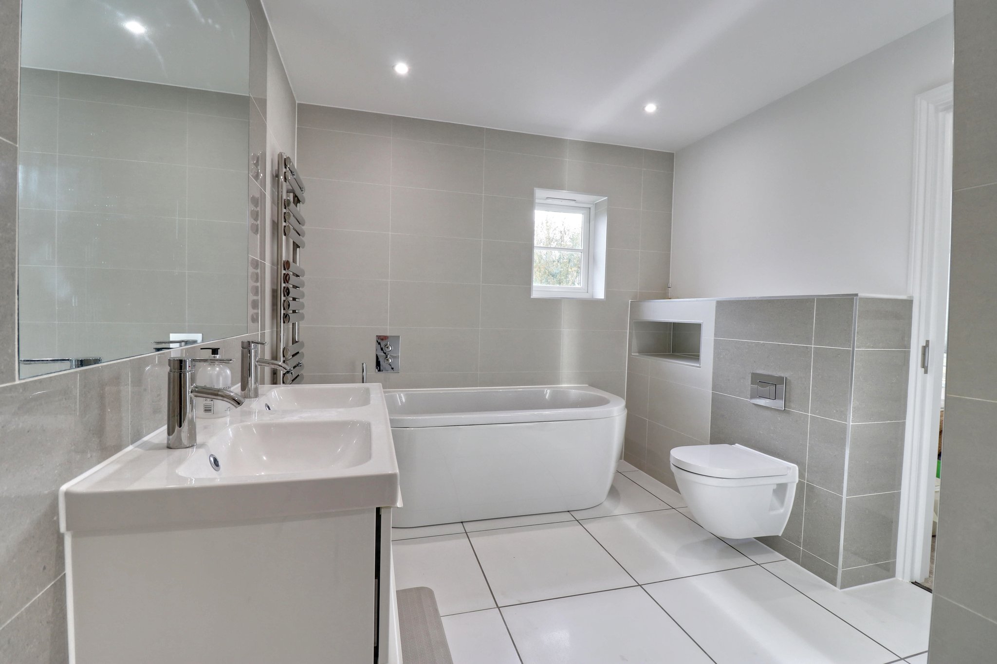 This attractive contemporary suite comprising a panel enclosed bath with off-set controls and pull-out shower, twin wash hand basins insert to a drawer unit with a monobloc tap, walk-in shower with a fixed head, removable screen and tiled seating, quality tiling to the walls and floor, window providing views to garden, floating WC, two chrome heated towel rails, tiled flooring.