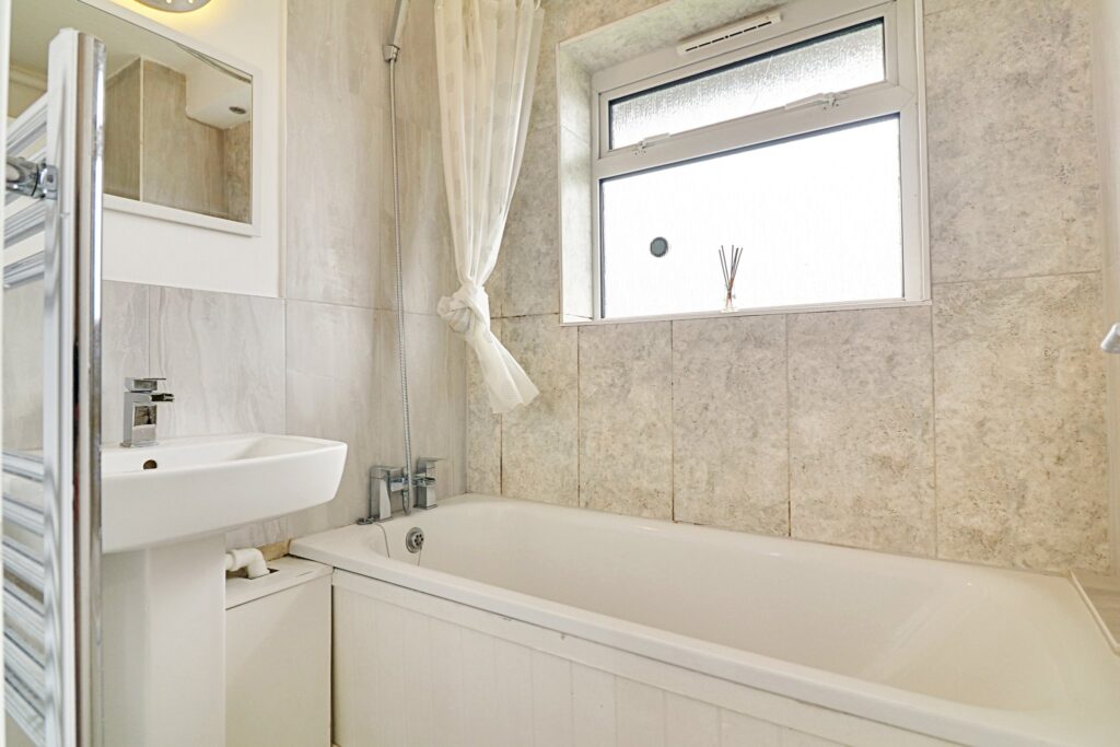 With panel enclosed bath with mixer tap and shower head attachment, pedestal wash hand basin, flush wc, double glazed windows to side, wall mounted heated towel rail, spotlighting to ceiling, tiled flooring
