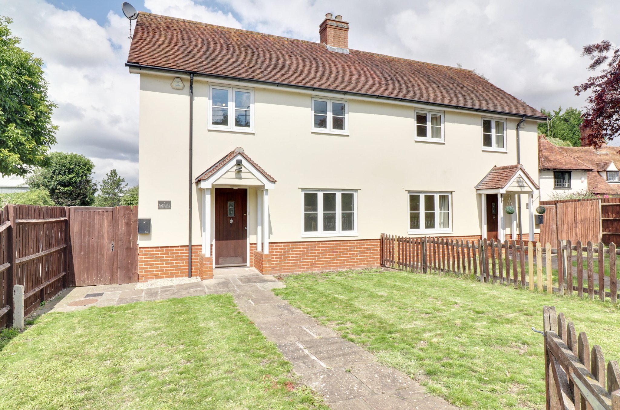 Enclosed by close board and picket fencing, paved path leading to front door, large lawn areas