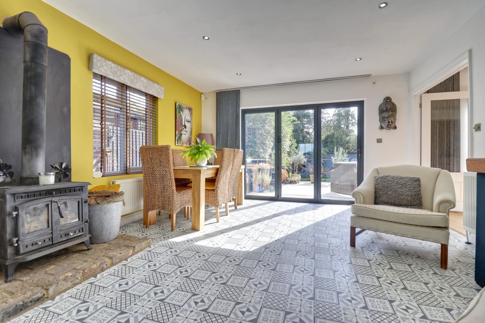 With a multi-fuel log burner with a raised brick hearth, window to side, bi-folding doors onto entertaining area, radiator, extensive spotlighting, tiled flooring.