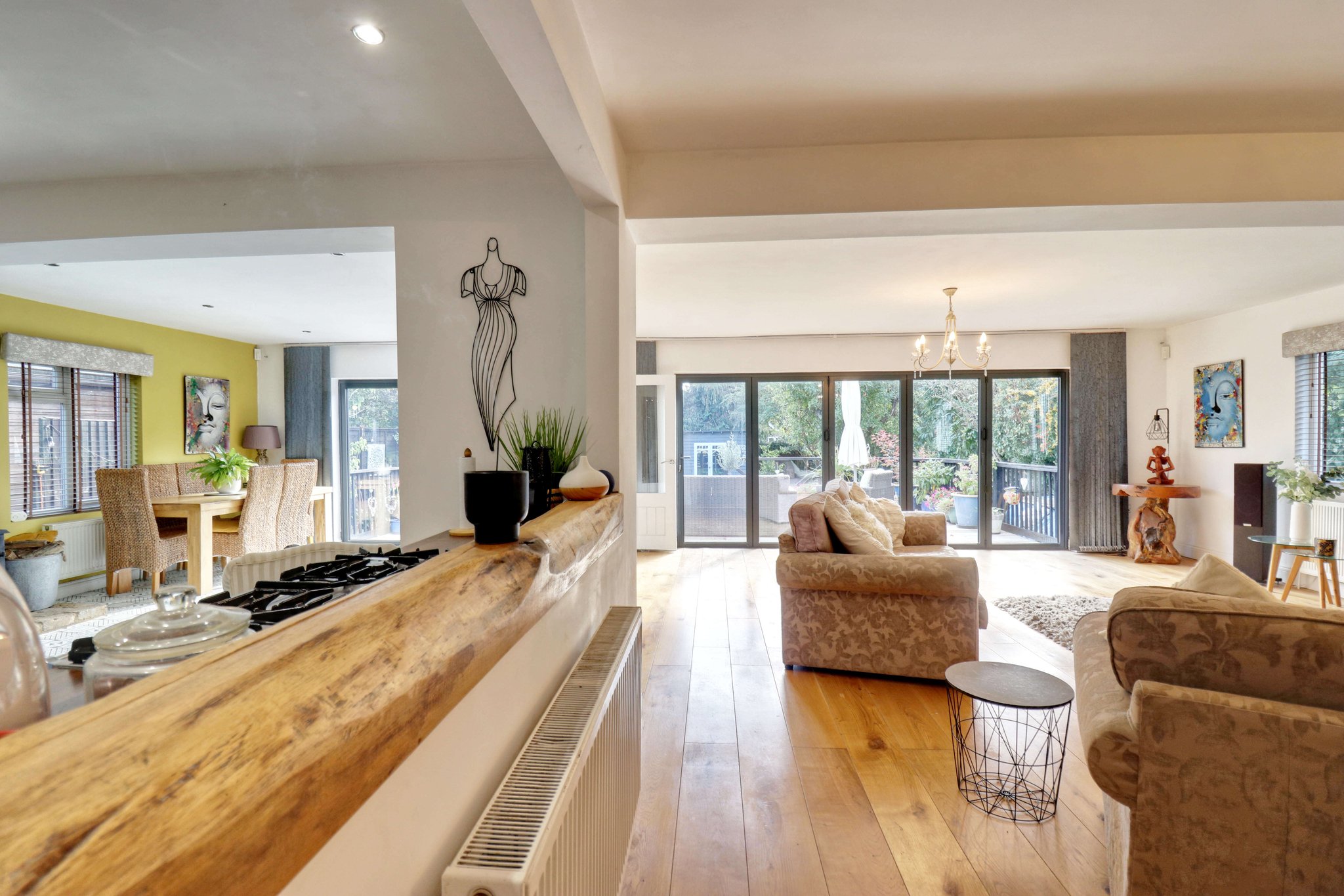 27' 0" x 17' 0" (8.23m x 5.18m) a stunning room with bi-folding doors to rear overlooking the garden, further double glazed windows to side, oak flooring, cast iron fireplace with a raised hearth, built-in shelving, radiators, double opening doors leading through into: