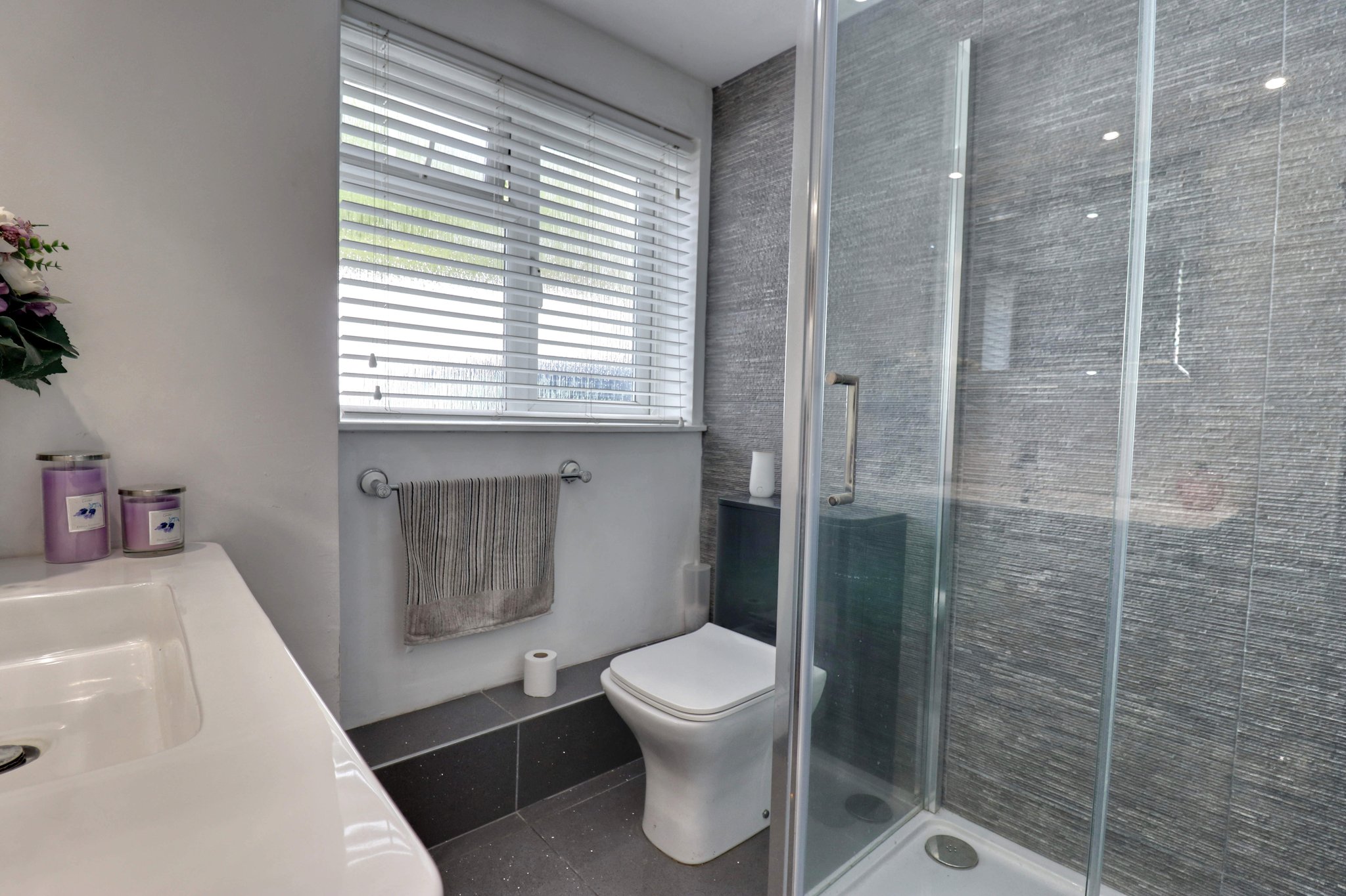 Comprising a walk-in shower cubicle with a glass screen, tiled walls and a thermostatically controlled shower, wall mounted wash hand basin, flush WC, heated towel rail, opaque double glazed window to side, fitted mirror.